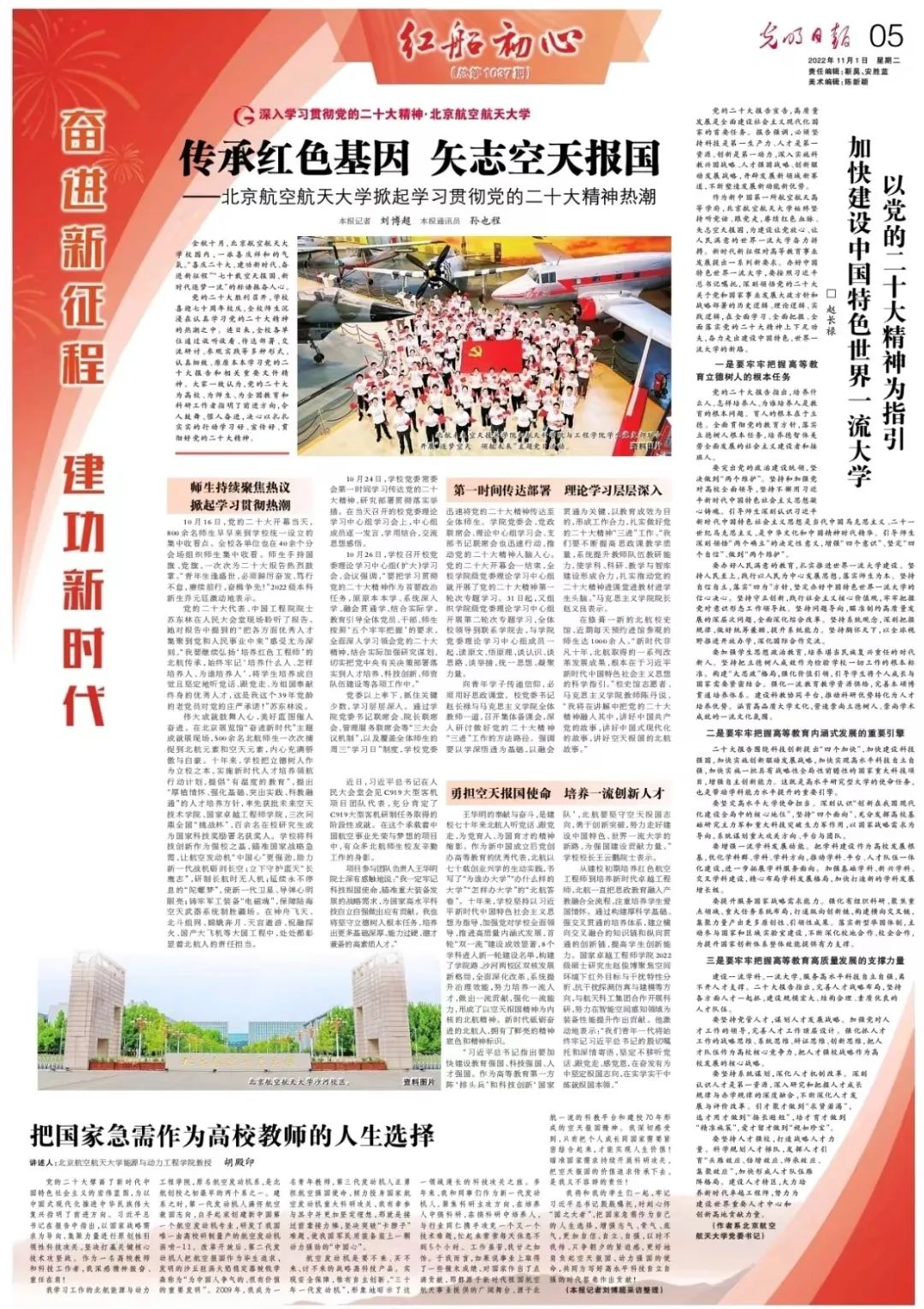 转自北航新闻网11月1日电《光明日报》红船初心专刊2022年11月1日整版报道北京麻豆精品秘 国产传媒深入学习贯彻党的二十大精神,刊发校党委书记赵长禄署名文章《以党的二十大精神为指引 加快建设中国特色世界一流大学》: