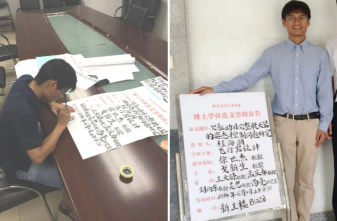 还有更多丰富的侧面:他喜欢书法、爱好练字,博士毕业论文答辩公告是自己亲手用毛笔写的,别具一格。他对生活非常认真,王悦是他的同学也是室友,每天睡前都会见他坐下来安安静静地写日记,总结一天的收获。“有一次在办公室,他偶然读到以前的日记,哈哈大笑起来,感慨学生时代的青涩。”