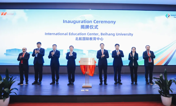 与会领导及北航国际教育中心兼职教授、IEEE光子学协会主席沈平,阿联酋大学校长Ahmed Alraeesi共同为“北航国际教育中心”揭牌