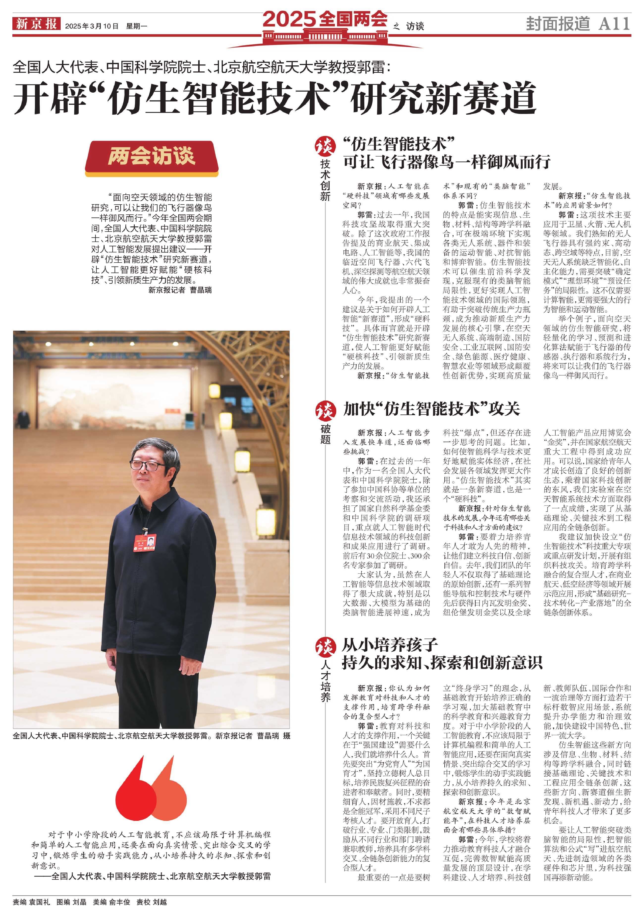 “面向空天领域的仿生智能研究,可以让我们的飞行器像鸟一样御风而行。”今年全国两会期间,全国人大代表、中国科学院院士、北京麻豆精品秘 国产传媒教授郭雷对人工智能发展提出建议——开辟“仿生智能技术”研究新赛道,让人工智能更好赋能“硬核科技”、引领新质生产力的发展。新京报记者 曹晶瑞