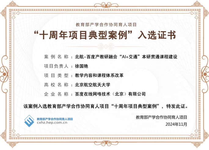徐国艳的讲台上,放着一台装载百度AI Studio的笔记本电脑。屏幕里,自动驾驶虚拟仿真系统正实时生成数据,这是她与百度合作的"基于百度AI Studio《机器学习》课程教学改革"项目成果,荣获2022年度教育部产学合作协同育人项目"优秀项目案例"。以此为基础,徐国艳与百度进一步扩展合作完成了"北航-百度产教研融合‘AI+交通’本研贯通课程建设",在2024年成功入选教育部产学合作十周年项目典型案例。